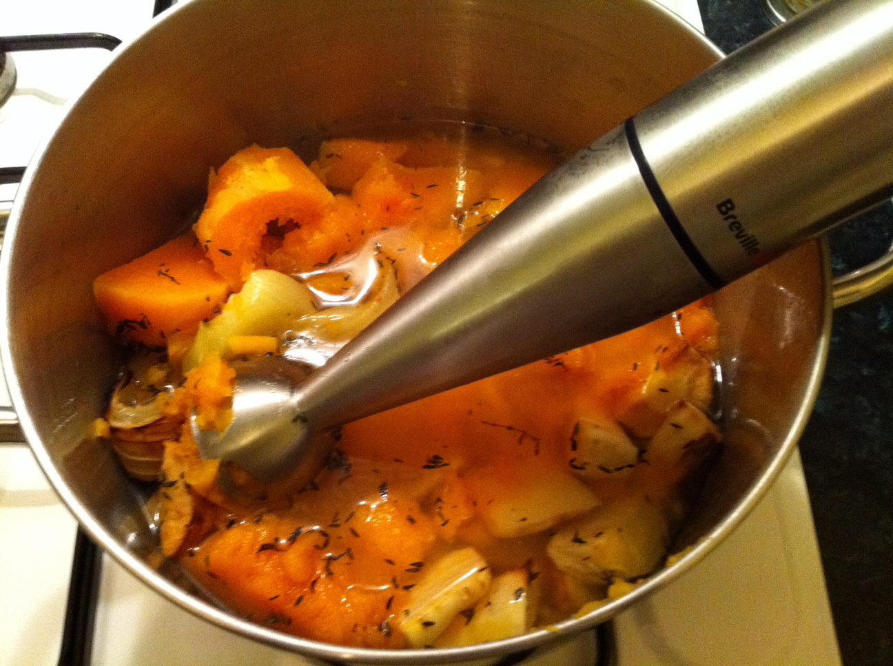 When the vegetables are done roasting, remove the thyme and crumble the toasted leaves into a soup pot. Peel the squash, cut it into chunks and put in the pot with the roasted onion and parsnip chunks. (Watch your fingers, the squash will be a little warm.) Toss in a stock cube and cover with boiling water. Whiz with a hand blender (do you like our shiny new one?) and serve with bread. Yum if I do say so myself.